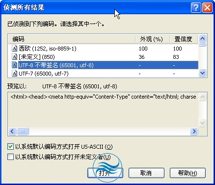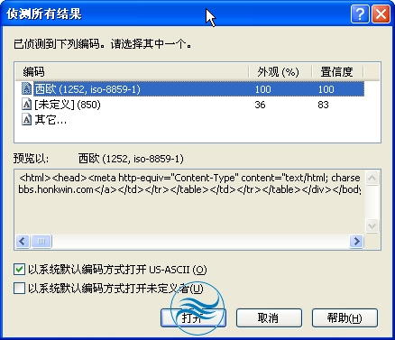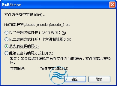 可以看到,Decode.txt的现在编码是gb2312,而emeditor鉴别出含有其它编码,不知为何他认为是西欧编码,并且置信度是100%,
